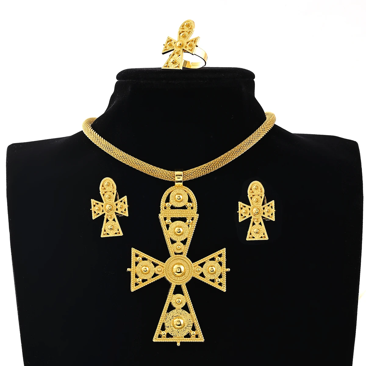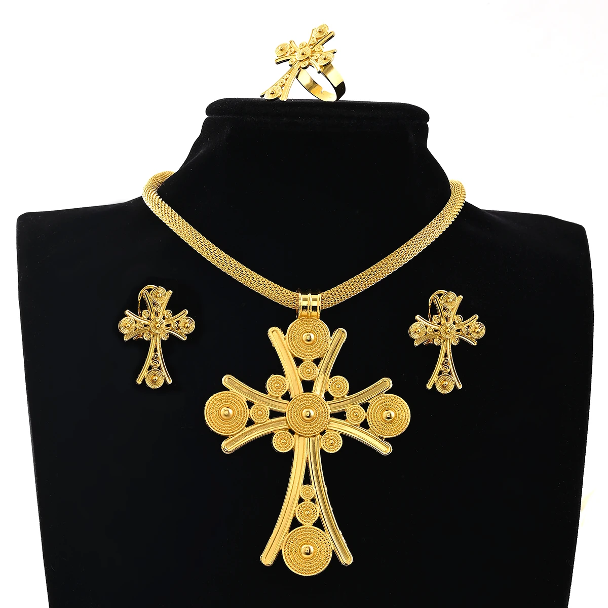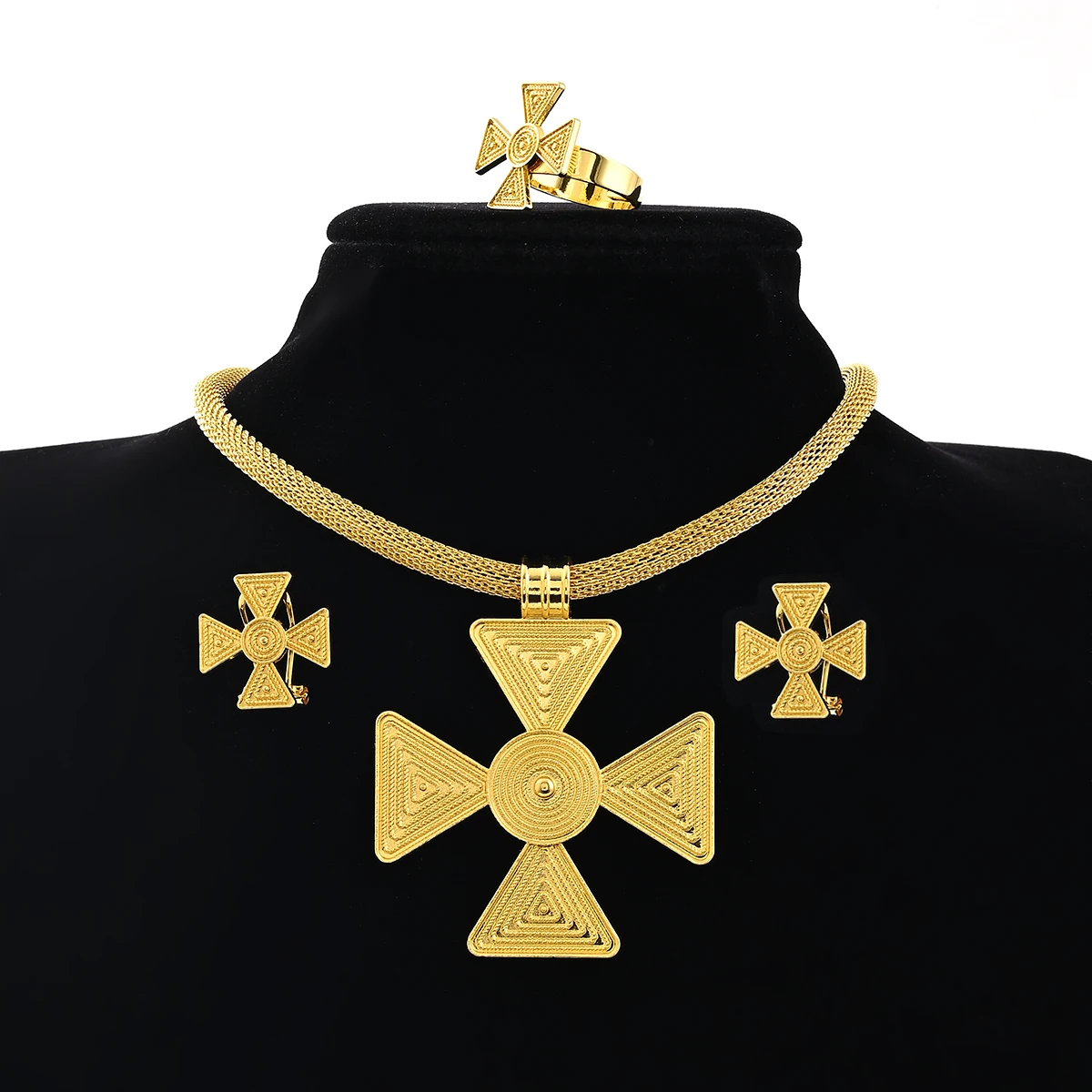 New Ethiopian Eritrea Cross Jewelry Sets Necklaces Earrings Rings for Women Girls African Ethnic Wedding Party Gifts
