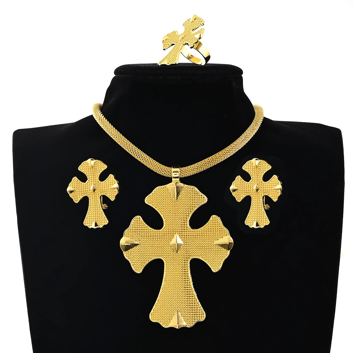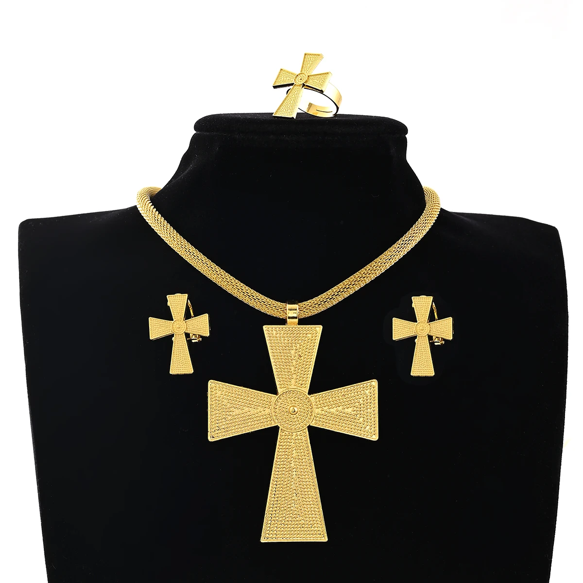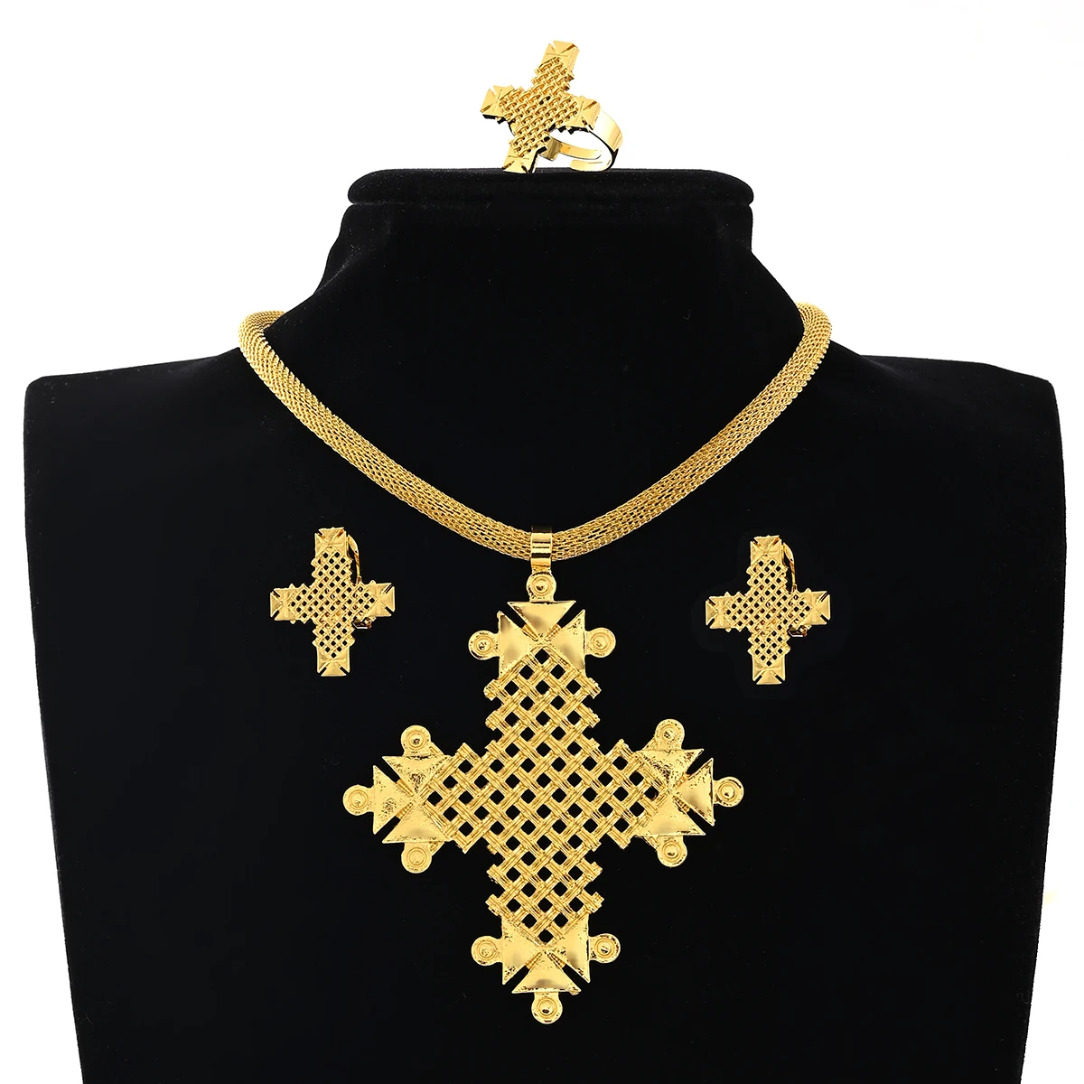 New Ethiopian Eritrea Cross Jewelry Sets Necklaces Earrings Rings for Women Girls African Ethnic Wedding Party Gifts