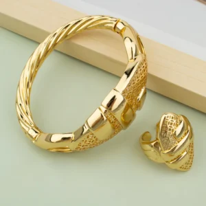 Cuff Bangle With Ring For Women 18K Gold Plated Bracelet Jewelry Nigerian Wedding Party Gift Dubai Hollow Out Design Bracelet